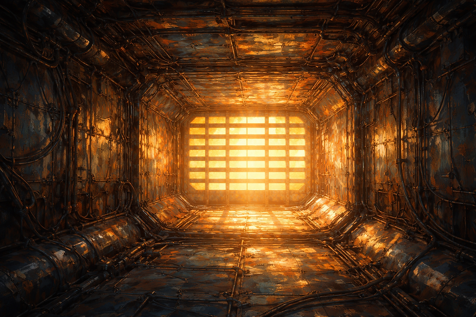 What did she think she would find here? Some piece of critical machinery? Another Compartment like her own? Something dangerous? From what she could see through the vent, the enormous, forever-sized compartment with the brown deck and blue ceiling didn’t hold anything dangerous. Yet, she sensed danger. Her deadly dance with the trochanter actuator felt like a game compared to the undefinable risks lurking in this air manifold at the far end of the outvent duct.